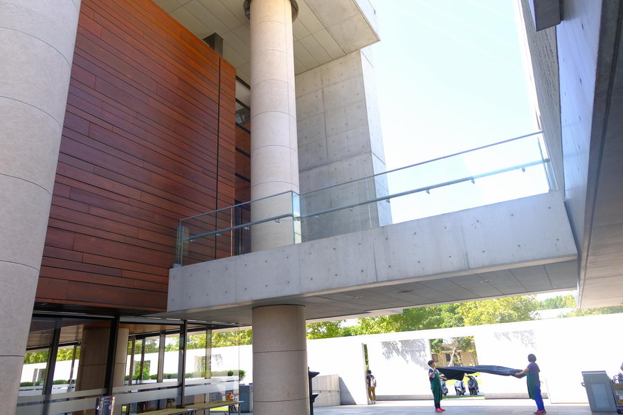 兩道清水混凝土牆被安置於園區與停車場之間,每道清水混凝土牆上有間隔相當的開口,但是兩道牆的開口互相等距交錯,所以因為角度的關係,近看無法看穿